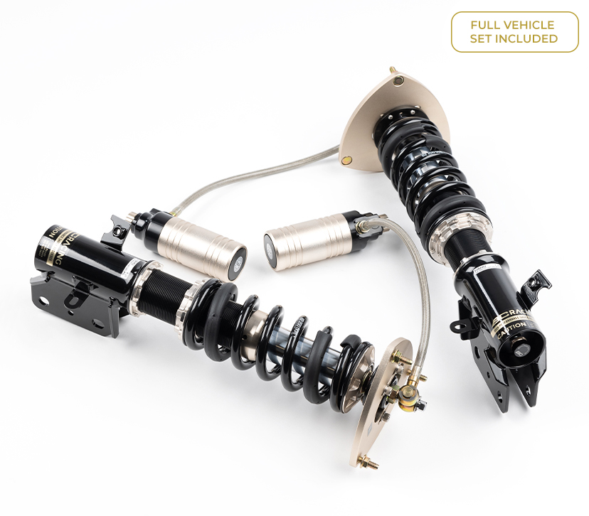 BC Racing's HM Coilover system offers the same great benefits of the RM Series with the addition of 2 way damping adjustment. Each HM Coilover system features inverted mono-tube dampers with independently adjustable compression and rebound. The inverted damper design moves vital damper fluid away from detrimental heat sources to avoid overheating which can cause damper fade under extreme track use.